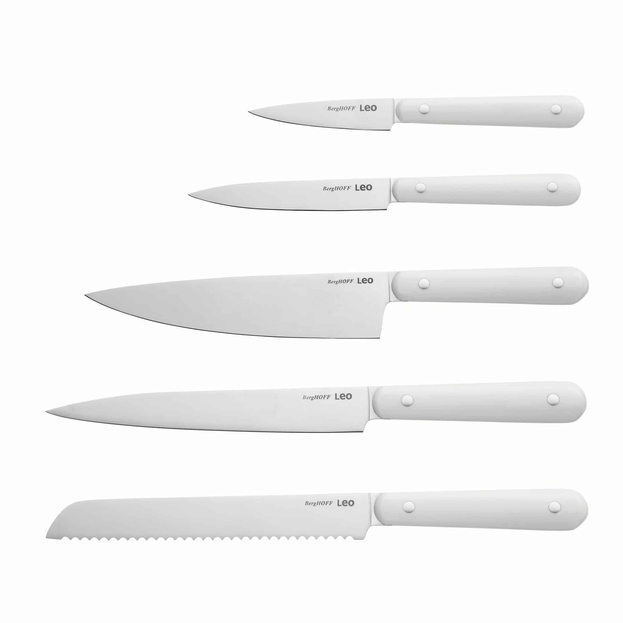 Špičková viacúčelová súprava nožov obsahujúca krájací nôž, úžitkový nôž, rezbársky nôž, nôž na chlieb a kuchársky nôž. Na zvládnutie všetkých vašich menších rezacích prác je krájací nôž a nožík dokonalým riešením. Rezací nôž, ktorý kĺže priamo cez mäso a hydinu, a nôž na chlieb, ktorý krája chlieb na rovnomerné plátky. K tomu všestranný kuchársky nôž na krájanie a krájanie vašich každodenných jedál.
