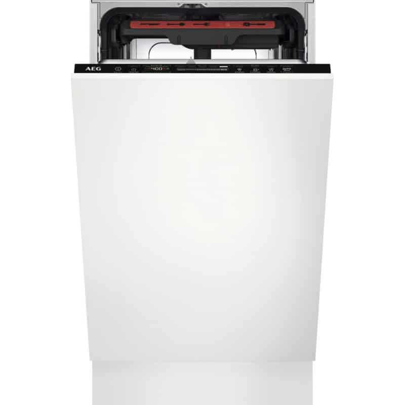 Úmyvačka riadu – plne integrovana 45 cm; AEG Mastery FSE73507P; Šírka (cm): 45; Technológia: AirDry/QuickSelect; Energetická trieda (norma E20): D; Počet sád: 10; Počet programov/teplot: 7/4; Spotreba vody (l): 11; Hlučnosť (dB): 43; Satelitné rameno: Áno; Príborová zásuvka: Áno; SoftGrips: 2; Vnútorné osvetlenie: Nie; Rozmery VxŠxH (mm): 818x450x550; Motor: Invertor motor se zárukou 10 rokov; Osvetlenie na podlahe: Dvoubarevný indikátor
