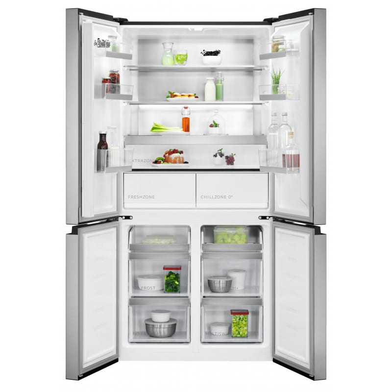 Viacdverová chladnička NF; AEG RMB952E6VU; Typ: 4 dverová; Šírka (cm): 91; Technológia: No Frost; En.trieda: E; Ovládanie: Elektronické, dotykové na dverách; Čistý objem chladničky/mrazničky (l): 342/179; Hlučnosť (dB): 39; Ventilátor: Multiflow; Nízkoteplotná zásuvka: Áno; Špeciálne funkcie: Zóna MultiSwitch+; Farba: Nerez s ochranou proti odtlačkom; Rozmery VxŠxH (mm): 1900x909x690