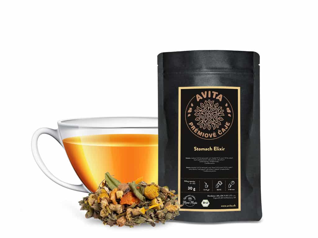 Organická čajová zmes Stomach Elixir v sebe kombinuje vybrané byliny, ktoré pôsobia blahodarne na vaše trávenie. Ide o zmes upokojujúcej medovky a harmančeka, a bylín pre podporu trávenia – aníz, fenikel, rasca. Výraznú korenistú chuť dopĺňajú sladké podtóny celých kúskov mrkvy a koreňa sladkého drievka.