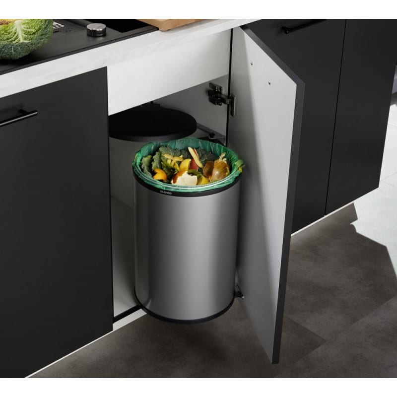 Praktický košový systém pre zabudovanie na dvierka. Kôš s objemom 20l. Pohodlne sa otvára spolu s dvierkami skrinky. Vhodný pre 45 cm spodnú skrinku.