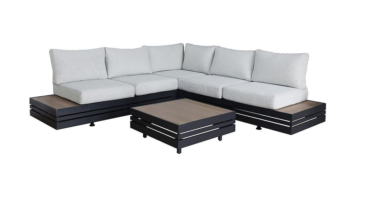 Luxusná hliníková súprava v antracitovom prevedení, doplnená o stolovú dosku z hliníka a živice v dezéne dreva.