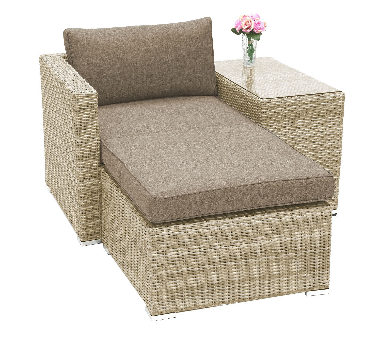Ratanový nábytok z kolekcie modulových setov, ktorý vyniká svojou variabilitou.Zostavte si súpravy podľa Vašich predstáv.Umelý ratan sa pýši svojím nadčasovým dizajnom a takmer nulovú údržbou. Polyetylénové vlákno sa vyznačuje vysokou pružnosťou, pevnosťou a odolnosťou voči vlhkosti i UV žiareniu. Je odolný voči povětrmostním podmienkam a je vhodný na celoročné státie vonku (odporúčame pod zastrešením alebo ochranným obalom v zimných mesiacoch). Umelý ratan je ľahký, takže zaisťuje pohodlnú manimulaci záhradného nábytku po záhrade či terase.Konštrukcia je vyrobená z robustnej hliníkovej konštrukcie, ktorá je zvarená tak, aby zaistila vysokú nosnosť jednotlivých prvkov. Hliník sa vyznačuje vysokou odolnosťou a pevnosťou. Nedochádza ku korózii.Polstrovanie je v sile 10 cm, jedná sa o látku s hustotou 220 g/m2. Lemovanie po krajoch. Penová výplň. Všetky podušky sú vybavené zipsom. Možnosť prania v práčke na 40 ° C bez aviváže.