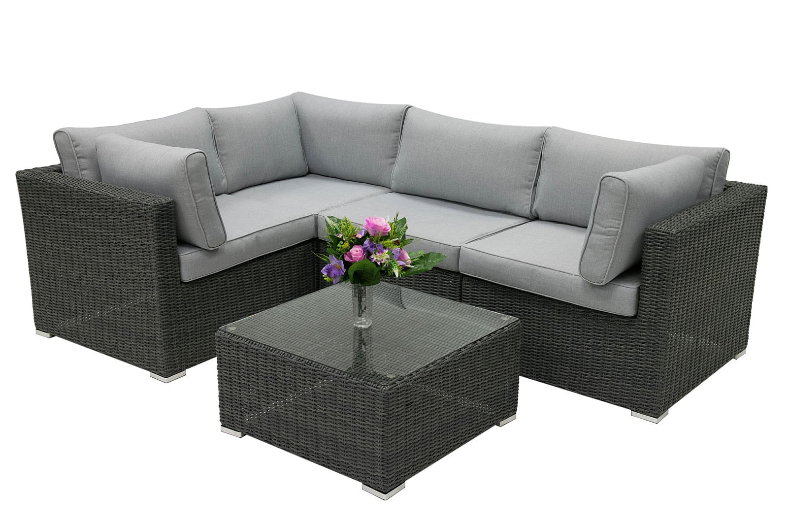 Nastaviteľná rovinnosť pomocou nožičiek. Sestava obsahuje: 3x Ratanový rohový diel SEVILLA (antracit), 1x Ratanový stredový diel SEVILLA (antracit), 1x Ratanový stolík/taburet SEVILLA (antracit)