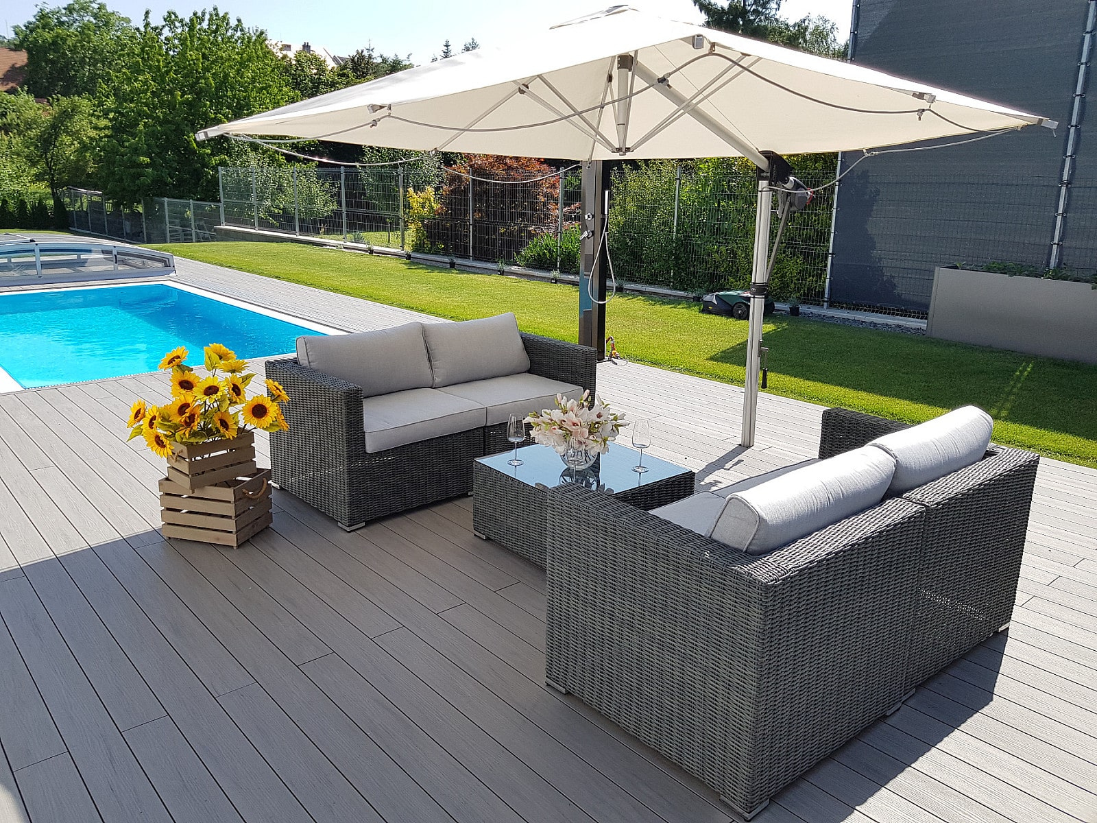 Nastaviteľná rovinnosť pomocou nožičiek. Sestava obsahuje: 4x Ratanový rohový diel SEVILLA (antracit), 1x Ratanový stolík/taburet SEVILLA (antracit)