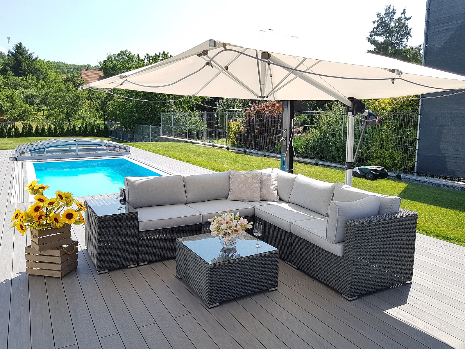 Ratanový nábytok z kolekcie modulových setov, ktorý vyniká svojou variabilitou.Zostavte si súpravy podľa Vašich predstáv.Umelý ratan sa pýši svojím nadčasovým dizajnom a takmer nulovú údržbou. Polyetylénové vlákno sa vyznačuje vysokou pružnosťou, pevnosťou a odolnosťou voči vlhkosti i UV žiareniu. Je odolný voči povětrmostním podmienkam a je vhodný na celoročné státie vonku (odporúčame pod zastrešením alebo ochranným obalom v zimných mesiacoch). Umelý ratan je ľahký, takže zaisťuje pohodlnú manimulaci záhradného nábytku po záhrade či terase.Konštrukcia je vyrobená z robustnej hliníkovej konštrukcie, ktorá je zvarená tak, aby zaistila vysokú nosnosť jednotlivých prvkov. Hliník sa vyznačuje vysokou odolnosťou a pevnosťou. Nedochádza ku korózii.Polstrovanie je v sile 10 cm, jedná sa o látku s hustotou 220 g/m2. Lemovanie po krajoch. Penová výplň. Všetky podušky sú vybavené zipsom. Možnosť prania v práčke na 40 ° C bez aviváže.