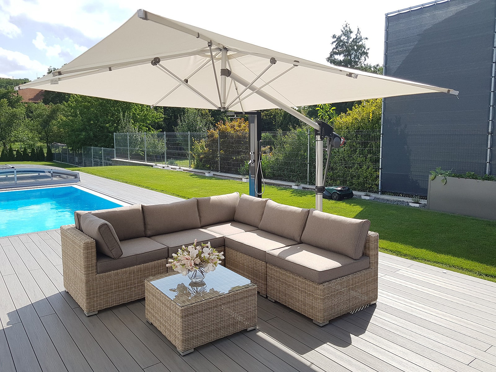 Ratanový nábytok z kolekcie modulových setov, ktorý vyniká svojou variabilitou.Zostavte si súpravy podľa Vašich predstáv.Umelý ratan sa pýši svojím nadčasovým dizajnom a takmer nulovú údržbou. Polyetylénové vlákno sa vyznačuje vysokou pružnosťou, pevnosťou a odolnosťou voči vlhkosti i UV žiareniu. Je odolný voči povětrmostním podmienkam a je vhodný na celoročné státie vonku (odporúčame pod zastrešením alebo ochranným obalom v zimných mesiacoch). Umelý ratan je ľahký, takže zaisťuje pohodlnú manimulaci záhradného nábytku po záhrade či terase.Konštrukcia je vyrobená z robustnej hliníkovej konštrukcie, ktorá je zvarená tak, aby zaistila vysokú nosnosť jednotlivých prvkov. Hliník sa vyznačuje vysokou odolnosťou a pevnosťou. Nedochádza ku korózii.Polstrovanie je v sile 10 cm, jedná sa o látku s hustotou 220 g/m2. Lemovanie po krajoch. Penová výplň. Všetky podušky sú vybavené zipsom. Možnosť prania v práčke na 40 ° C bez aviváže.