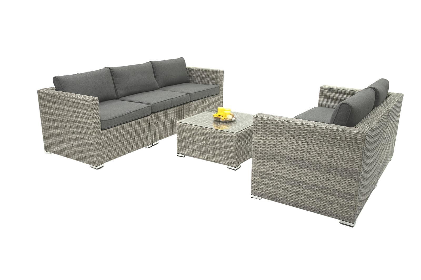 Ratanový nábytok z kolekcie modulových setov, ktorý vyniká svojou variabilitou.Zostavte si súpravy podľa Vašich predstáv.Umelý ratan sa pýši svojím nadčasovým dizajnom a takmer nulovú údržbou. Polyetylénové vlákno sa vyznačuje vysokou pružnosťou, pevnosťou a odolnosťou voči vlhkosti i UV žiareniu. Je odolný voči povětrmostním podmienkam a je vhodný na celoročné státie vonku (odporúčame pod zastrešením alebo ochranným obalom v zimných mesiacoch). Umelý ratan je ľahký, takže zaisťuje pohodlnú manimulaci záhradného nábytku po záhrade či terase.Konštrukcia je vyrobená z robustnej hliníkovej konštrukcie, ktorá je zvarená tak, aby zaistila vysokú nosnosť jednotlivých prvkov. Hliník sa vyznačuje vysokou odolnosťou a pevnosťou. Nedochádza ku korózii.Polstrovanie je v sile 10 cm, jedná sa o látku s hustotou 220 g/m2. Lemovanie po krajoch. Penová výplň. Všetky podušky sú vybavené zipsom. Možnosť prania v práčke na 40 ° C bez aviváže.