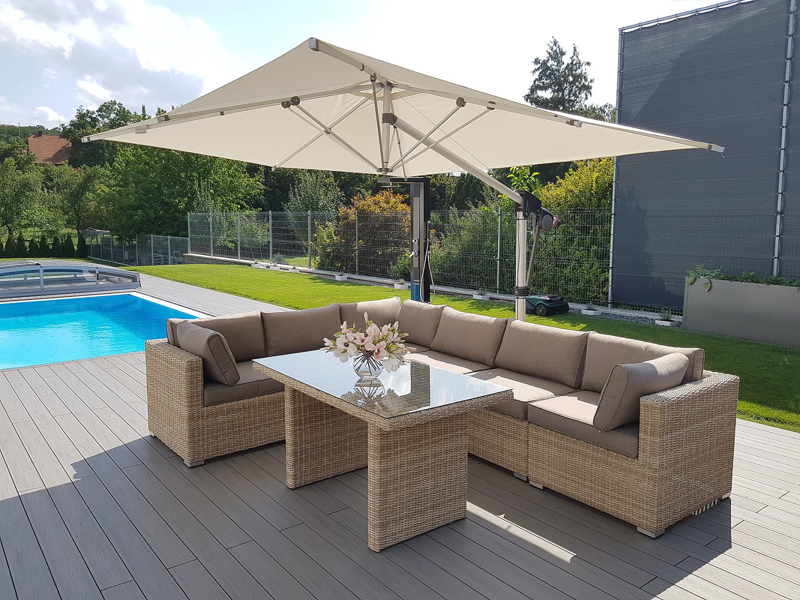 Ratanový nábytok z kolekcie modulových setov, ktorý vyniká svojou variabilitou.Zostavte si súpravy podľa Vašich predstáv.Umelý ratan sa pýši svojím nadčasovým dizajnom a takmer nulovú údržbou. Polyetylénové vlákno sa vyznačuje vysokou pružnosťou, pevnosťou a odolnosťou voči vlhkosti i UV žiareniu. Je odolný voči povětrmostním podmienkam a je vhodný na celoročné státie vonku (odporúčame pod zastrešením alebo ochranným obalom v zimných mesiacoch). Umelý ratan je ľahký, takže zaisťuje pohodlnú manimulaci záhradného nábytku po záhrade či terase.Konštrukcia je vyrobená z robustnej hliníkovej konštrukcie, ktorá je zvarená tak, aby zaistila vysokú nosnosť jednotlivých prvkov. Hliník sa vyznačuje vysokou odolnosťou a pevnosťou. Nedochádza ku korózii.Polstrovanie je v sile 10 cm, jedná sa o látku s hustotou 220 g/m2. Lemovanie po krajoch. Penová výplň. Všetky podušky sú vybavené zipsom. Možnosť prania v práčke na 40 ° C bez aviváže.