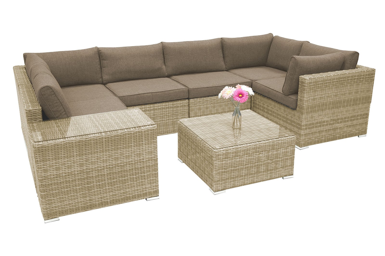 Ratanový nábytok z kolekcie modulových setov, ktorý vyniká svojou variabilitou.Zostavte si súpravy podľa Vašich predstáv.Umelý ratan sa pýši svojím nadčasovým dizajnom a takmer nulovú údržbou. Polyetylénové vlákno sa vyznačuje vysokou pružnosťou, pevnosťou a odolnosťou voči vlhkosti i UV žiareniu. Je odolný voči povětrmostním podmienkam a je vhodný na celoročné státie vonku (odporúčame pod zastrešením alebo ochranným obalom v zimných mesiacoch). Umelý ratan je ľahký, takže zaisťuje pohodlnú manimulaci záhradného nábytku po záhrade či terase.Konštrukcia je vyrobená z robustnej hliníkovej konštrukcie, ktorá je zvarená tak, aby zaistila vysokú nosnosť jednotlivých prvkov. Hliník sa vyznačuje vysokou odolnosťou a pevnosťou. Nedochádza ku korózii.Polstrovanie je v sile 10 cm, jedná sa o látku s hustotou 220 g/m2. Lemovanie po krajoch. Penová výplň. Všetky podušky sú vybavené zipsom. Možnosť prania v práčke na 40 ° C bez aviváže.