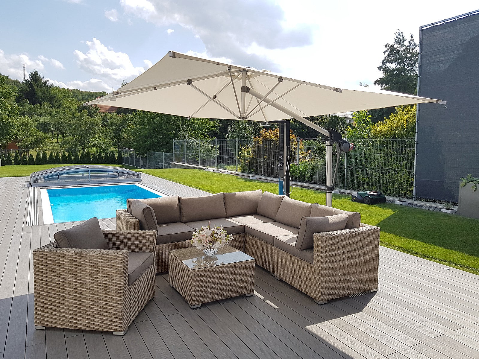 Ratanový nábytok z kolekcie modulových setov, ktorý vyniká svojou variabilitou.Zostavte si súpravy podľa Vašich predstáv.Umelý ratan sa pýši svojím nadčasovým dizajnom a takmer nulovú údržbou. Polyetylénové vlákno sa vyznačuje vysokou pružnosťou, pevnosťou a odolnosťou voči vlhkosti i UV žiareniu. Je odolný voči povětrmostním podmienkam a je vhodný na celoročné státie vonku (odporúčame pod zastrešením alebo ochranným obalom v zimných mesiacoch). Umelý ratan je ľahký, takže zaisťuje pohodlnú manimulaci záhradného nábytku po záhrade či terase.Konštrukcia je vyrobená z robustnej hliníkovej konštrukcie, ktorá je zvarená tak, aby zaistila vysokú nosnosť jednotlivých prvkov. Hliník sa vyznačuje vysokou odolnosťou a pevnosťou. Nedochádza ku korózii.Polstrovanie je v sile 10 cm, jedná sa o látku s hustotou 220 g/m2. Lemovanie po krajoch. Penová výplň. Všetky podušky sú vybavené zipsom. Možnosť prania v práčke na 40 ° C bez aviváže.