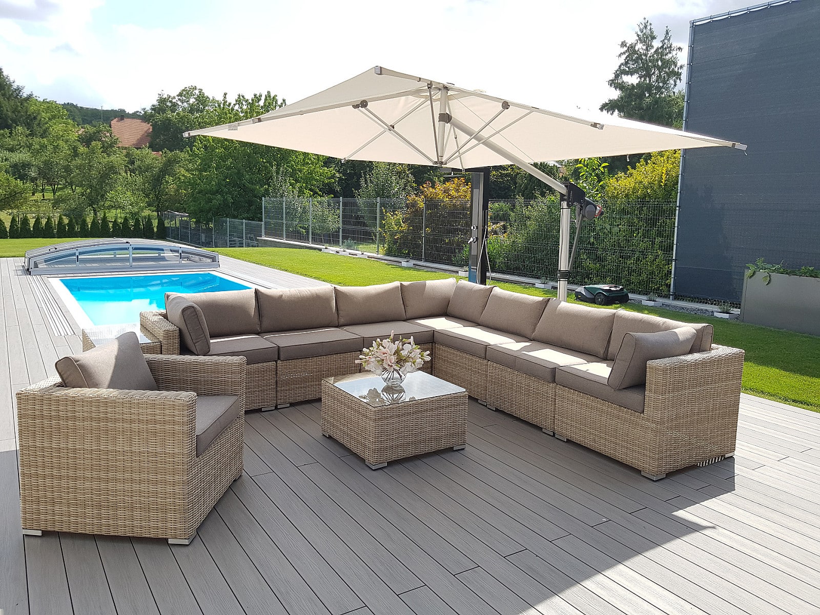 Ratanový nábytok z kolekcie modulových setov, ktorý vyniká svojou variabilitou.Zostavte si súpravy podľa Vašich predstáv.Umelý ratan sa pýši svojím nadčasovým dizajnom a takmer nulovú údržbou. Polyetylénové vlákno sa vyznačuje vysokou pružnosťou, pevnosťou a odolnosťou voči vlhkosti i UV žiareniu. Je odolný voči povětrmostním podmienkam a je vhodný na celoročné státie vonku (odporúčame pod zastrešením alebo ochranným obalom v zimných mesiacoch). Umelý ratan je ľahký, takže zaisťuje pohodlnú manimulaci záhradného nábytku po záhrade či terase.Konštrukcia je vyrobená z robustnej hliníkovej konštrukcie, ktorá je zvarená tak, aby zaistila vysokú nosnosť jednotlivých prvkov. Hliník sa vyznačuje vysokou odolnosťou a pevnosťou. Nedochádza ku korózii.Polstrovanie je v sile 10 cm, jedná sa o látku s hustotou 220 g/m2. Lemovanie po krajoch. Penová výplň. Všetky podušky sú vybavené zipsom. Možnosť prania v práčke na 40 ° C bez aviváže.