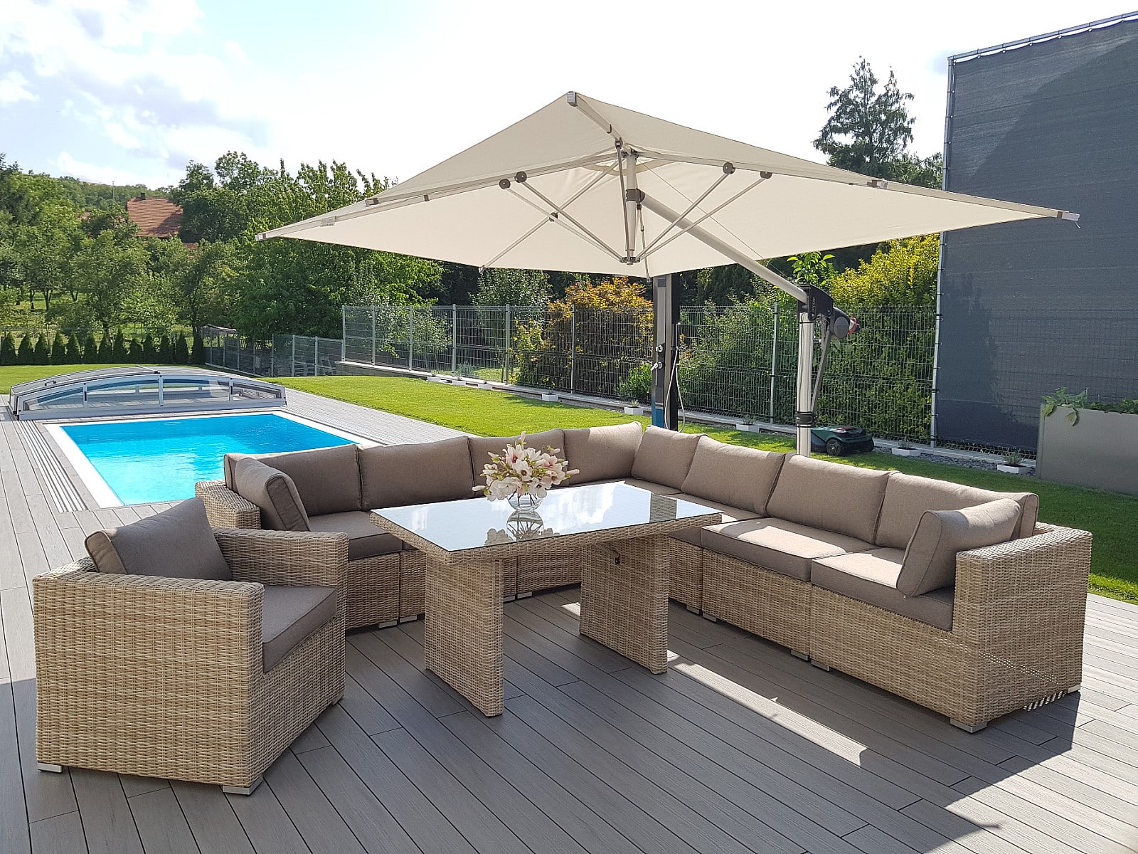 Ratanový nábytok z kolekcie modulových setov, ktorý vyniká svojou variabilitou.Zostavte si súpravy podľa Vašich predstáv.Umelý ratan sa pýši svojím nadčasovým dizajnom a takmer nulovú údržbou. Polyetylénové vlákno sa vyznačuje vysokou pružnosťou, pevnosťou a odolnosťou voči vlhkosti i UV žiareniu. Je odolný voči povětrmostním podmienkam a je vhodný na celoročné státie vonku (odporúčame pod zastrešením alebo ochranným obalom v zimných mesiacoch). Umelý ratan je ľahký, takže zaisťuje pohodlnú manimulaci záhradného nábytku po záhrade či terase.Konštrukcia je vyrobená z robustnej hliníkovej konštrukcie, ktorá je zvarená tak, aby zaistila vysokú nosnosť jednotlivých prvkov. Hliník sa vyznačuje vysokou odolnosťou a pevnosťou. Nedochádza ku korózii.Polstrovanie je v sile 10 cm, jedná sa o látku s hustotou 220 g/m2. Lemovanie po krajoch. Penová výplň. Všetky podušky sú vybavené zipsom. Možnosť prania v práčke na 40 ° C bez aviváže.