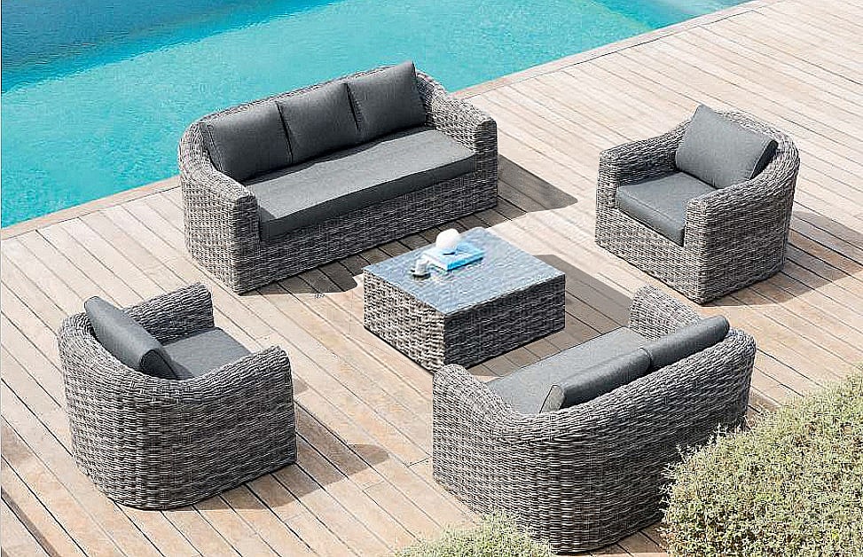 Sestava obsahuje: 1x Ratanová lavica pre 3 osoby BORNEO (sivá), 1x Ratanová lavica pre 2 osoby BORNEO LUXURY (sivá), 2x Ratanové kreslo BORNEO LUXURY (sivá), 1x Ratanové stolík BORNEO LUXURY (sivá)