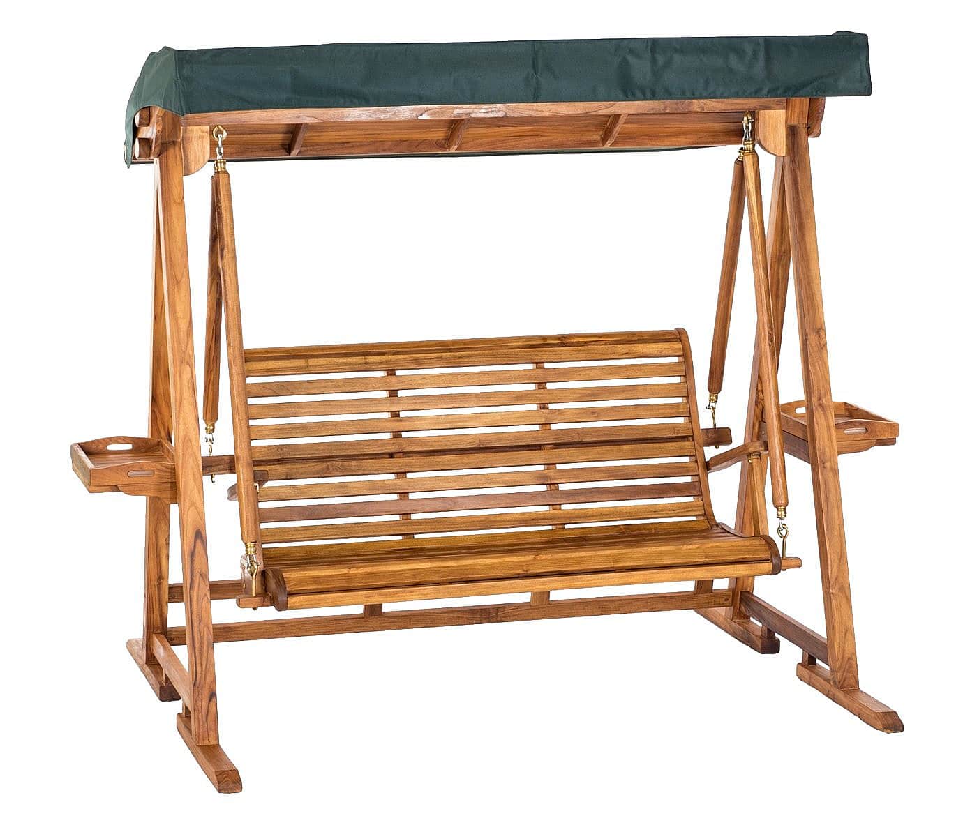 Záhradná hojdačka AVANTI II je vyrobená z prvotriedneho jadrového indonézskeho teaku. Vonkajšia hojdačka má výrazný a pôsobivý vzhľad vďaka detailnému spracovaniu jednotlivých častí. Strechu je možné jednoducho natáčať podľa potreby zatienenia. Ku komfortu prispievajú aj snímateľné podnosy. Súčasťou je aj veľmi praktická plachta cez strechu v zelenej farbe. Ošetrená teakovým olejom.