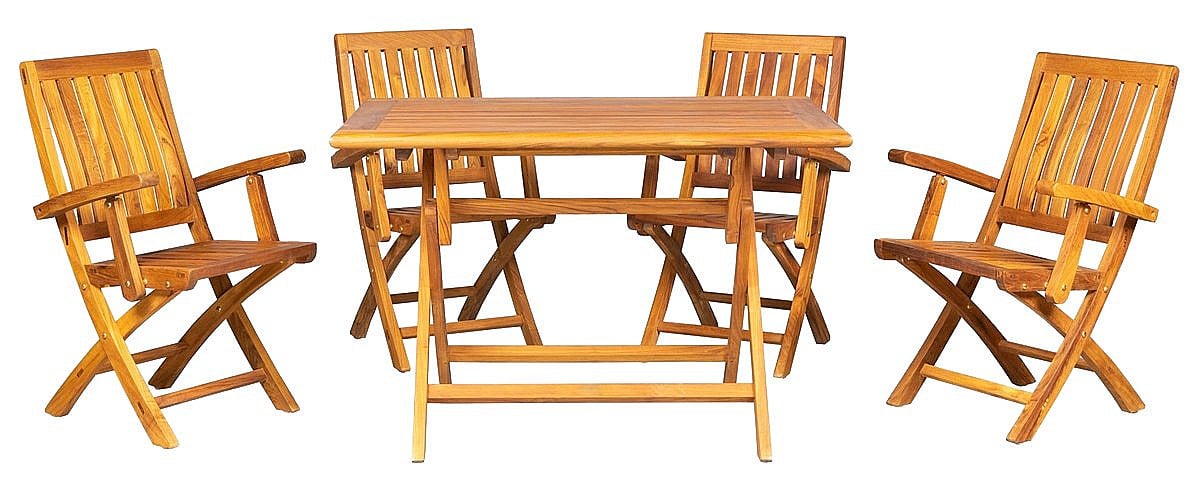 Sestava obsahuje: 1x Teakový stôl DANTE, 2x Teaková stolička ANNA, 1x Teaková lavica PIETRO