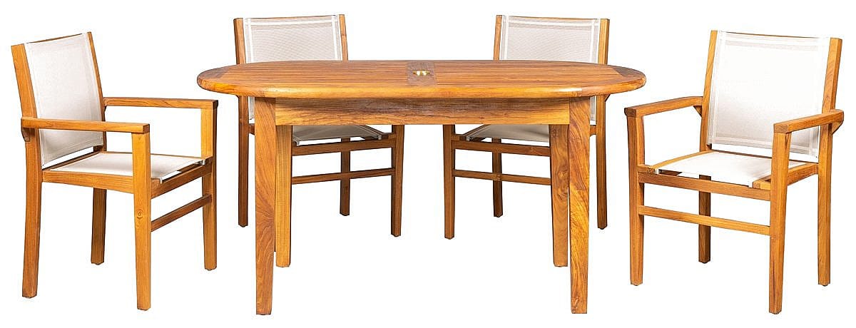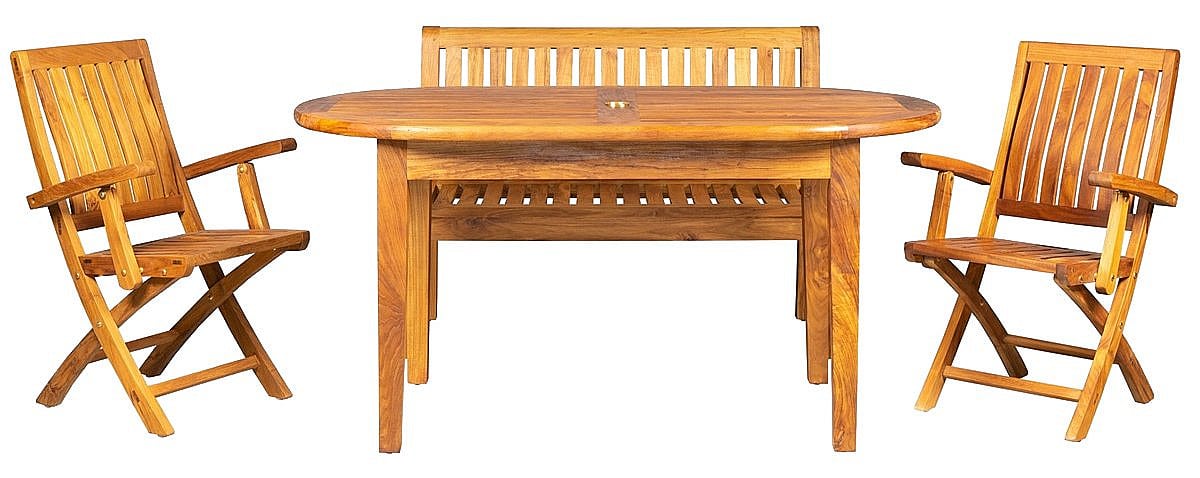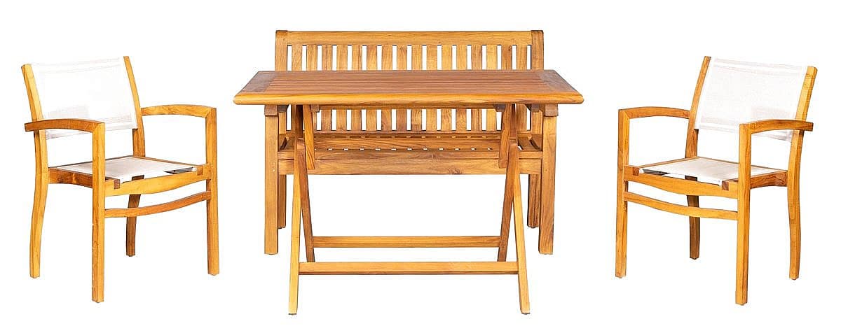 Sestava obsahuje: 1x Teakový stôl DANTE, 4x Skladacia teaková stolička NOEMI