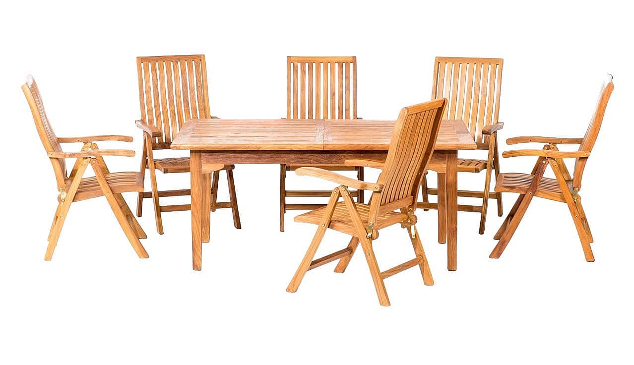 Sestava obsahuje: 1x Teakový stôl ELEGANTE, 6x Skladacie teakové kreslo RIVA