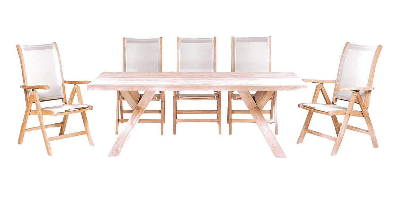 Sestava obsahuje: 1x Teakový stôl SPIDER RECYCLE, 6x Skladacie teakové kreslo DIVA