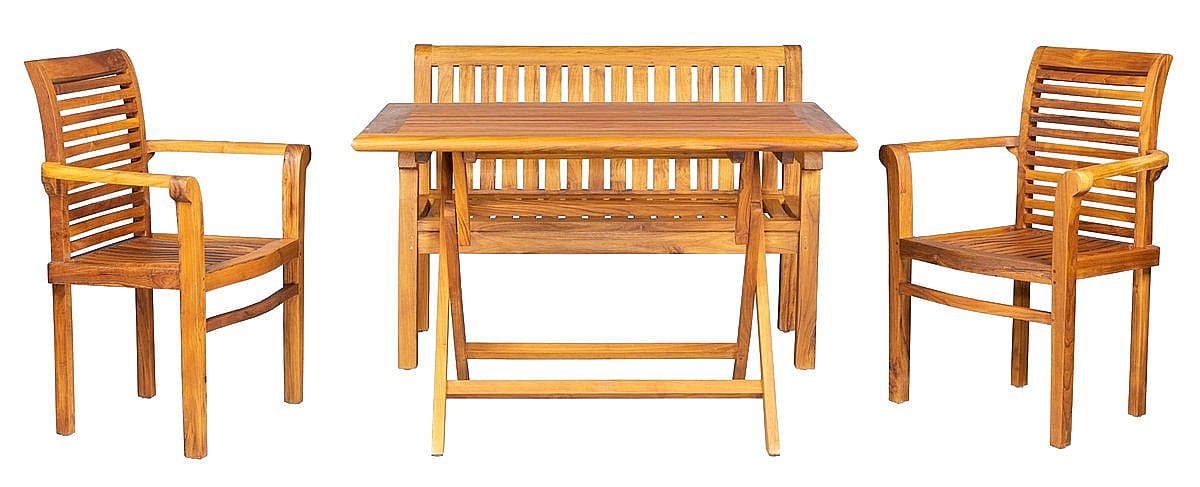 Sestava obsahuje: 1x Teakový skladací stôl VASCO, 2x Teakové kreslo PARIS, 1x Teaková lavica PIETRO