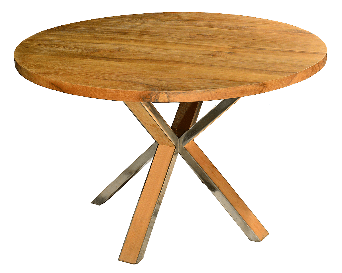 Okrúhla doska z kvalitného teaku. Svojou originalitou jednoducho doplní moderný štýl Vášho interiéru. Pevná kovová konštrukcia s doskou činný stôl stabilný na svojom mieste.