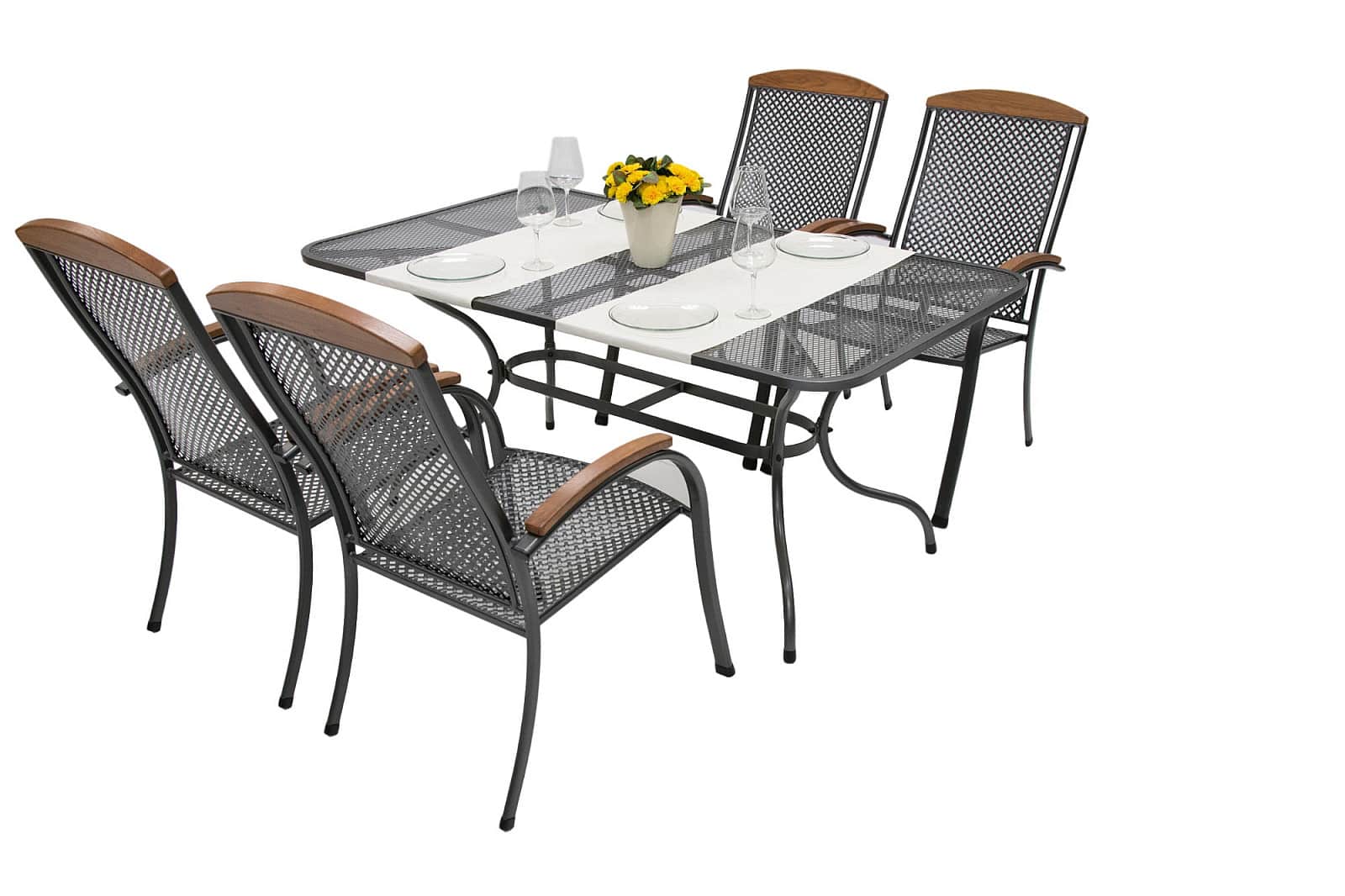 Zahŕňa obdĺžnikový stôl vo veľkosti podľa vášho výberu a 4 stohovateľné kreslá s vysokou nosnosťou 130 kg. Chladný kov pôsobivo dopĺňa jaseňové drevo na podrúčkach stoličiek a vytvára originálny nábytok, ktorý nestretnete na každej druhej záhrade v susedstve . Nábytok nie je ťažký a manipuláciu s ním zvládne každý.