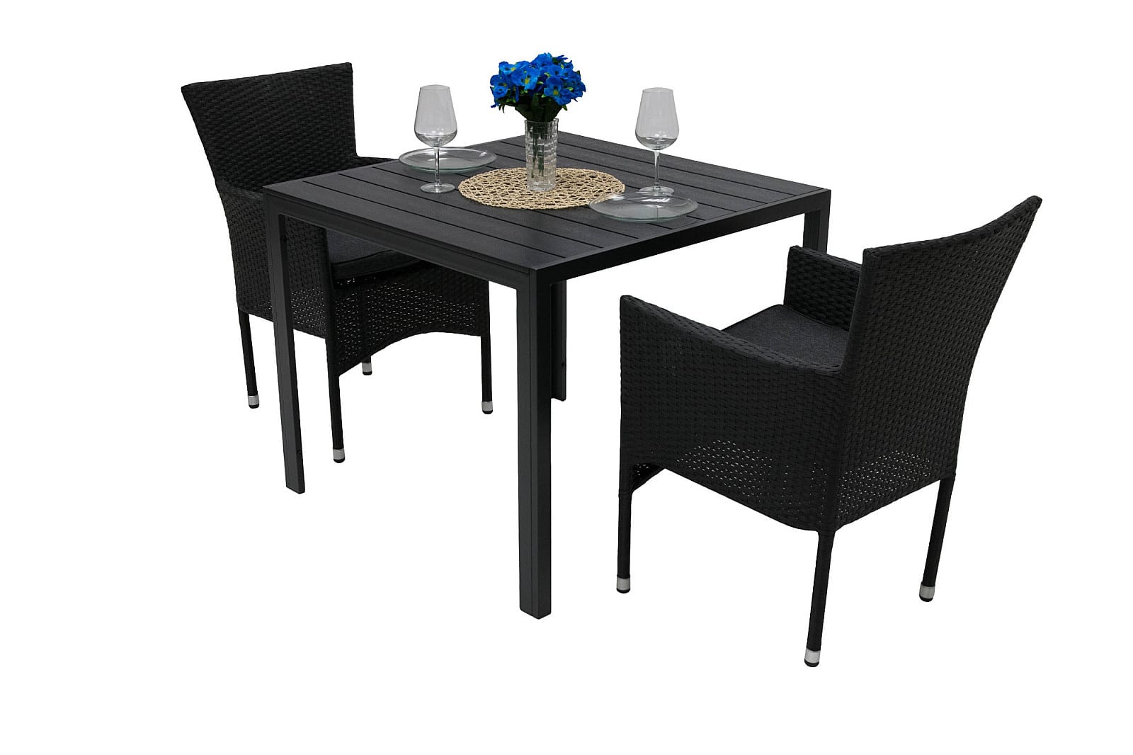 Vyberte si nové záhradné posedenie online z pohodlia domova! Preskúmajte všetky záhradné zostavy z umelého ratanu a urobte si radosť kvalitným záhradným nábytkom. Sestava obsahuje: 2x Ratanové kreslo stohovateľné PALERMO s poduškou (čierna), 1x Hliníkový stôl TRENTO 90 x 90 cm