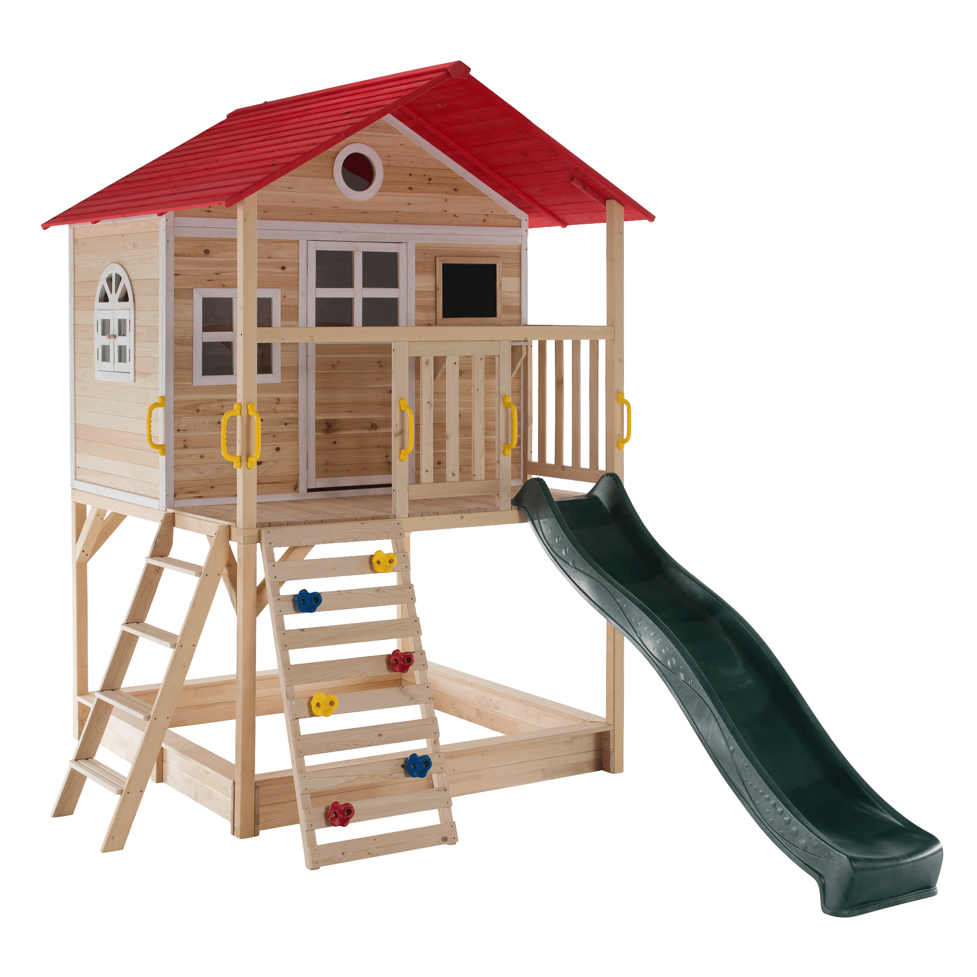 Drevený záhradný domček so šmykľavkou, pieskoviskom a lezeckou stenou, OMAH