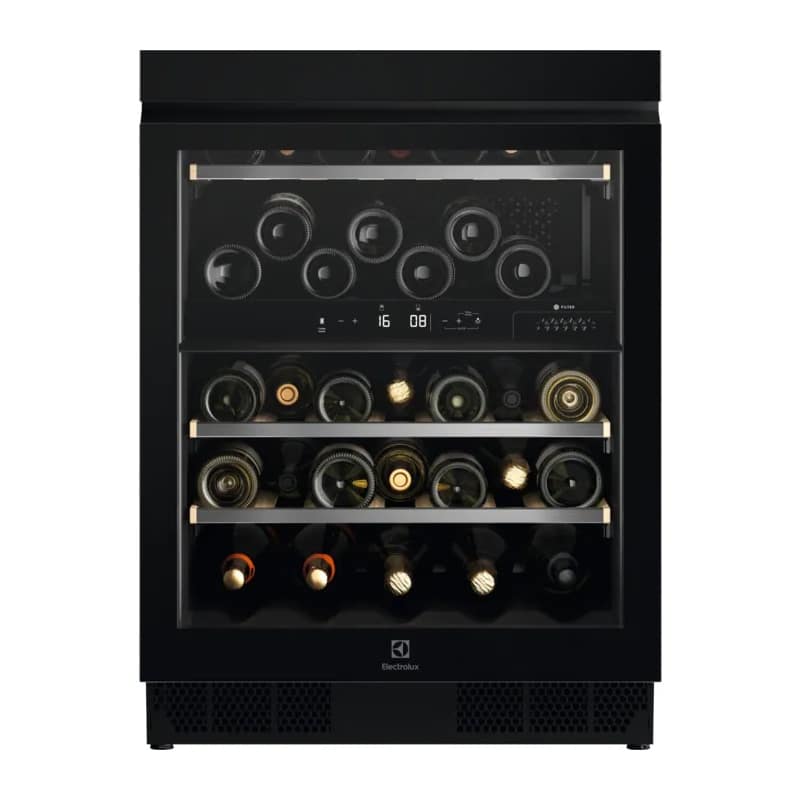 Vstavaná vinotéka, Trieda energetickej účinnosti: G, Celkový objem (lit.): 122, Hlučnosť: 36 dB, Farba/dizajn chladničky: Black Glossy Glass, Poličky chladničky: 3 plnej šírky, Wood with trim, Rozmery: 818 x 595 x 577 mm
