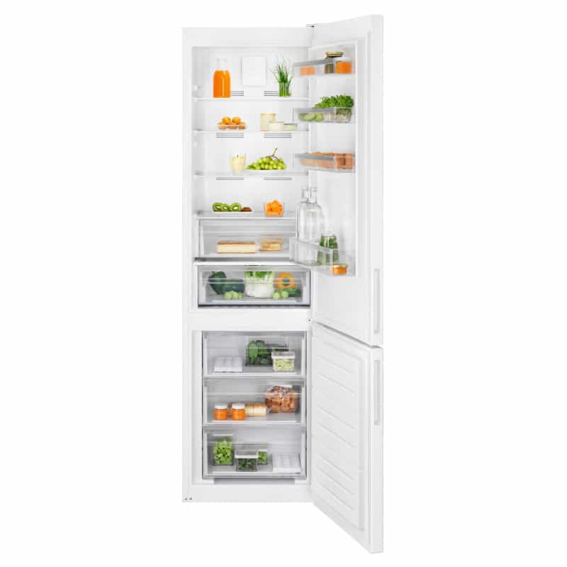 Chladnička kombinovaná s mrazničkou dole NF; Electrolux 600 TwinTech LNT5ME36W1; Výška (cm): 201; Technológia: No Frost; En.trieda: E; Čistý objem chladničky/mrazničky (l): 266/101; Ovládanie: Elektronické, interné; Displej: Nie; Hlučnosť (dB): 38; Ventilátor: MultiFlow; Nízkoteplotná zásuvka: ExtraChill; Custom Flex: Nie; Farba: Biela; Motor: Invertor ; Rozmer VxŠxH (mm): 2010x595x650; Madlá: Integrované vertikálne
