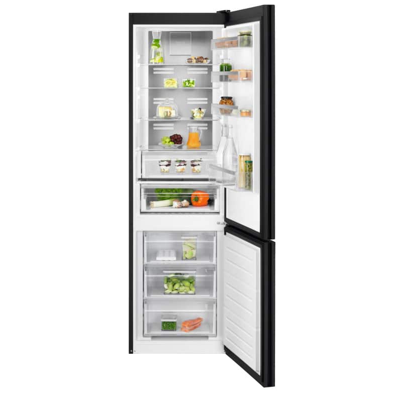 Chladnička kombinovaná s mrazničkou dole NF; Electrolux 800 Cooling 360 LNT7ME36K2; Výška (cm): 201; Technológia: No Frost; En.trieda: E; Čistý objem chladničky/mrazničky (l): 266/101; Ovládanie: Elektronické, interné; Displej: Nie; Hlučnosť (dB): 38; Ventilátor: Metal MultiFlow; Nízkoteplotná zásuvka: ExtraChill; Custom Flex: Nie; Farba: Čierne sklo; Motor: Invertor s 10 ročnou zárukou; Rozmer VxŠxH (mm): 2010x595x650; Madlá: Integrované vertikálne