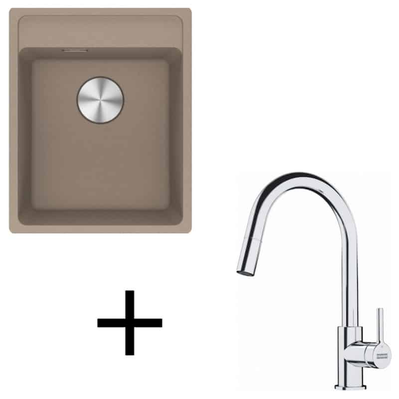 kašmír, Set G252 pozostáva zo špecifického drezu MRG 610-37 RTL, ktorý je vďaka svojim rovným líniám jednoduchý na údržbu a chrómovej batérie FS 3229.031, ktorá disponuje s vyťahovacou koncovkou osadenou perlátorom.