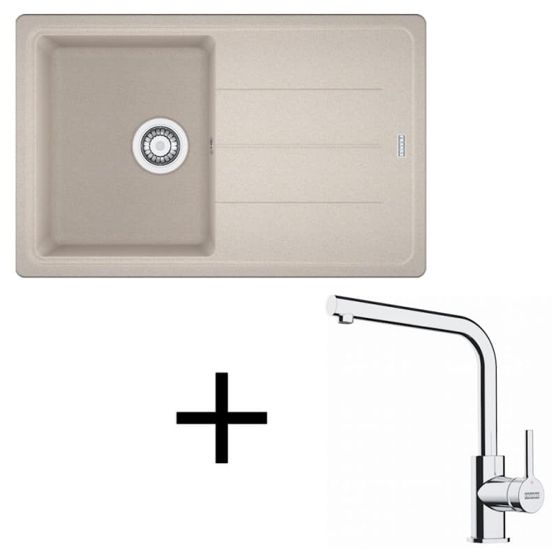 sahara, Set G263 ponúka spojenie drezu BFG 611 a batéie FS 3230.031. Drez je obojstranne zabudovateľný a určený pre montáž na pracovnú dosku. Minimalistické prvky chrómovej batérieandnbsp;vytváraja v kombinácii s granitovým drezom moderný dizajn, vhodný do akéhokoľvek kuchynského prostredia.
