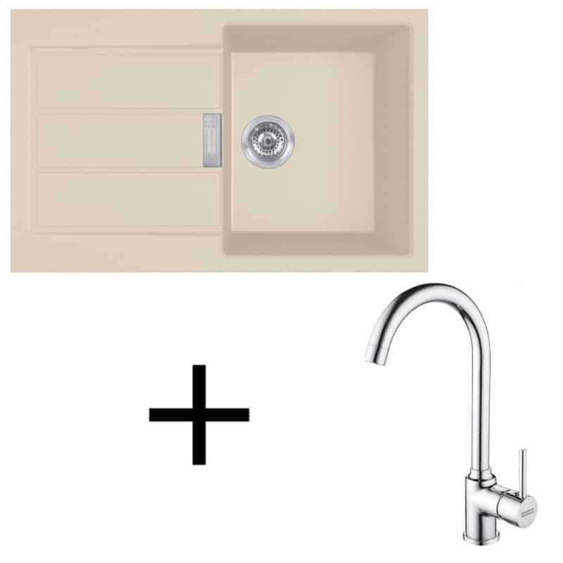 béžová, Set je ideálnym riešením pre modernú kuchyňu za výhodnú cenu. Drez je obojstranný a určený pre montáž na pracovnú dosku. Má veľkú vaničku a priestrannú odkladaciu plochu, čo umožňuje viac komfortu pri umývaní riadov či príprave jedál. Batéria v lesklom chrómovom prevedení dodáva setu elegantný dizajn.