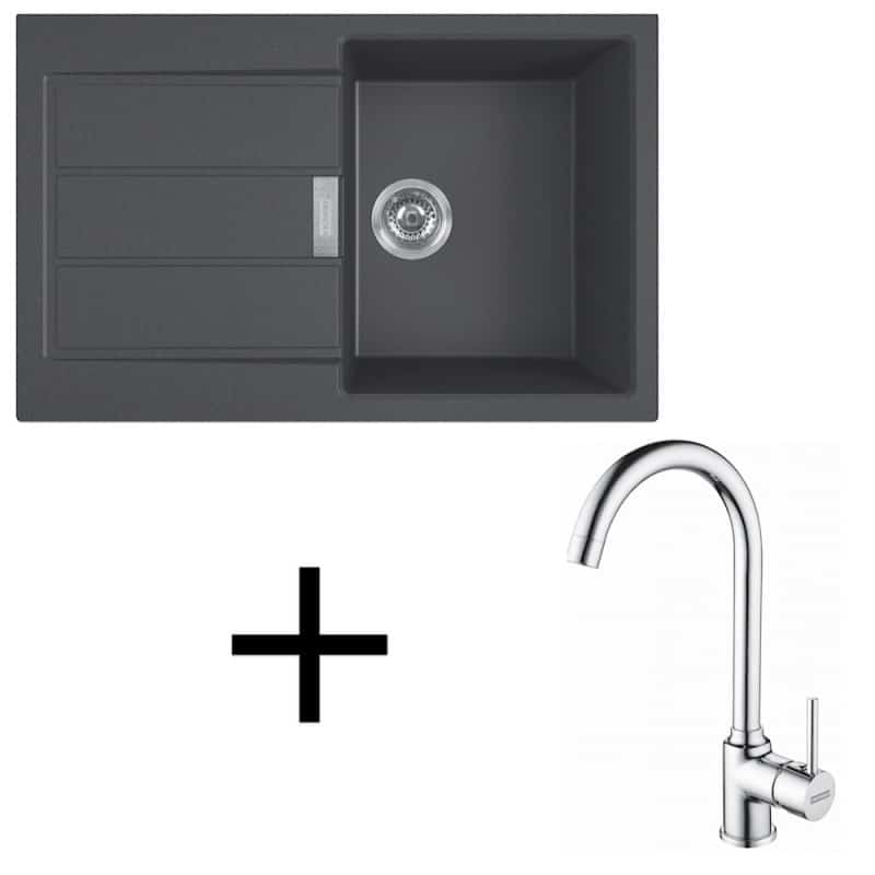 čierna, Set je ideálnym riešením pre modernú kuchyňu za výhodnú cenu. Drez je obojstranný a určený pre montáž na pracovnú dosku. Má veľkú vaničku a priestrannú odkladaciu plochu, čo umožňuje viac komfortu pri umývaní riadov či príprave jedál. Batéria v lesklom chrómovom prevedení dodáva setu elegantný dizajn.
