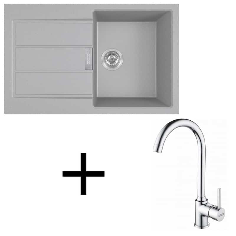 šedá, Set je ideálnym riešením pre modernú kuchyňu za výhodnú cenu. Drez je obojstranný a určený pre montáž na pracovnú dosku. Má veľkú vaničku a priestrannú odkladaciu plochu, čo umožňuje viac komfortu pri umývaní riadov či príprave jedál. Batéria v lesklom chrómovom prevedení dodáva setu elegantný dizajn.