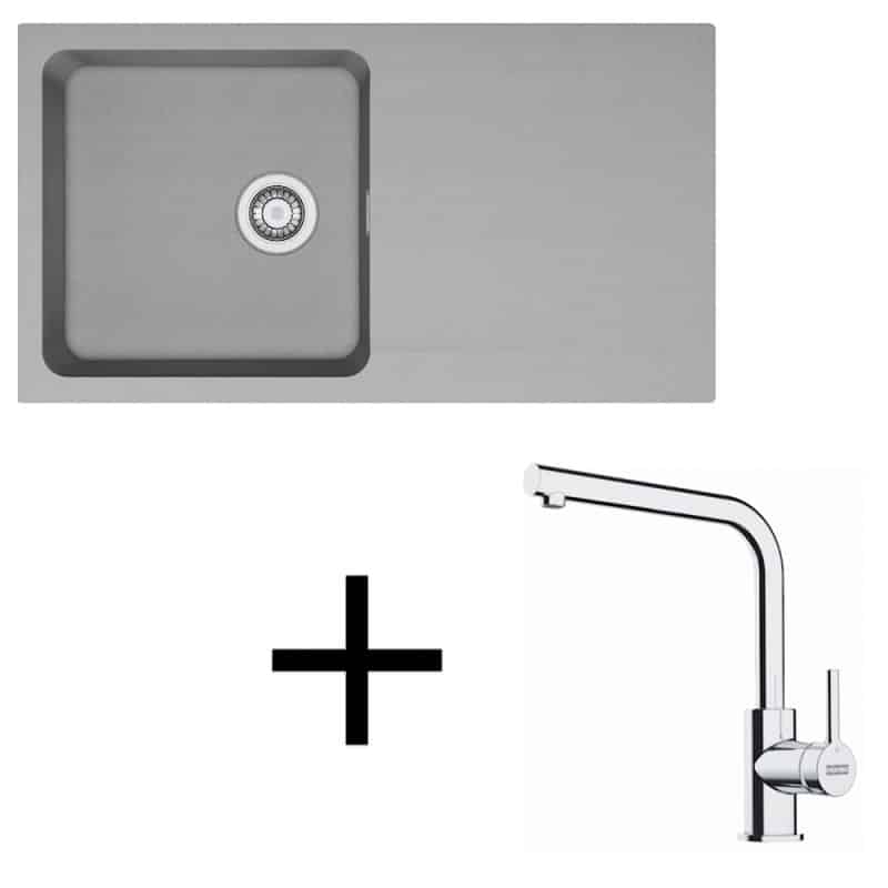 šedá, Nadčasový set pozostáva z kombinácie drezu OID 611 a batérie FS 3230. Materiál Tectonite® zabezpečuje trvanlivosť a jednoduchú údržbu, zatiaľ čo metalická batéria v luxusnom chrómovom prevedení dodáva kuchyni moderný dizajn.