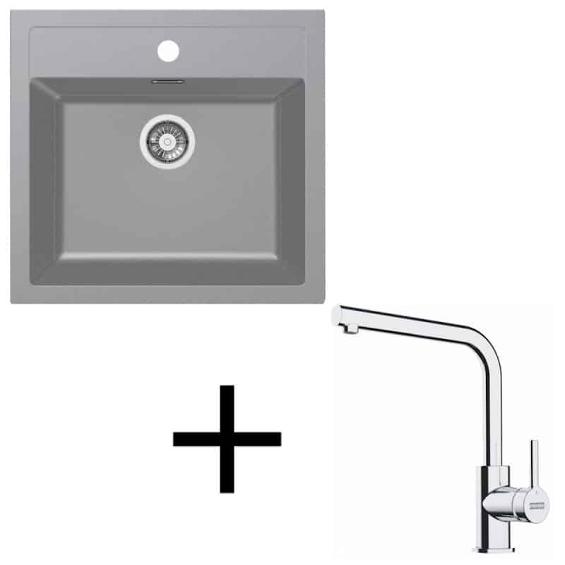šedá, Set kombinuje modenrý dizajn s kvalitnými materiálmi, ktoré zabezpečujú trvanlivosť a eleganciu v kuchyni. Drez je jednoduchý na údržbu a určený pre montáž na pracovnú dosku. Vyznačuje sa svojou veľkou vaničkou, ktorej hĺbka je až 200 mm. Metalická batéria v chrómovom prevedení má otáčateľný odtok až o 360°.