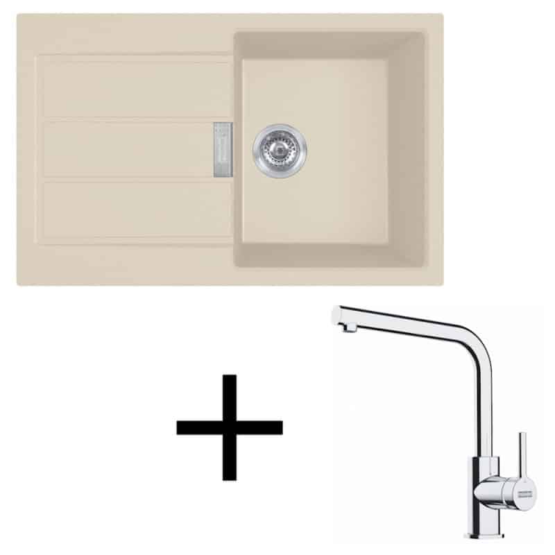 béžová, Set T115 pozostáva z kompozitného drezu a nerezovej batérie. Obojstranný drez je určený pre montáž na pracovnú dosku. Má veľkú vaničku s hĺbkou až 200 mm. Chrómová batéria je vyrobená z materiálu s prirodzene hygienicky čistým povrchom, ktorý sa vďaka svojej pozpórovitosti jednoducho udržiava.