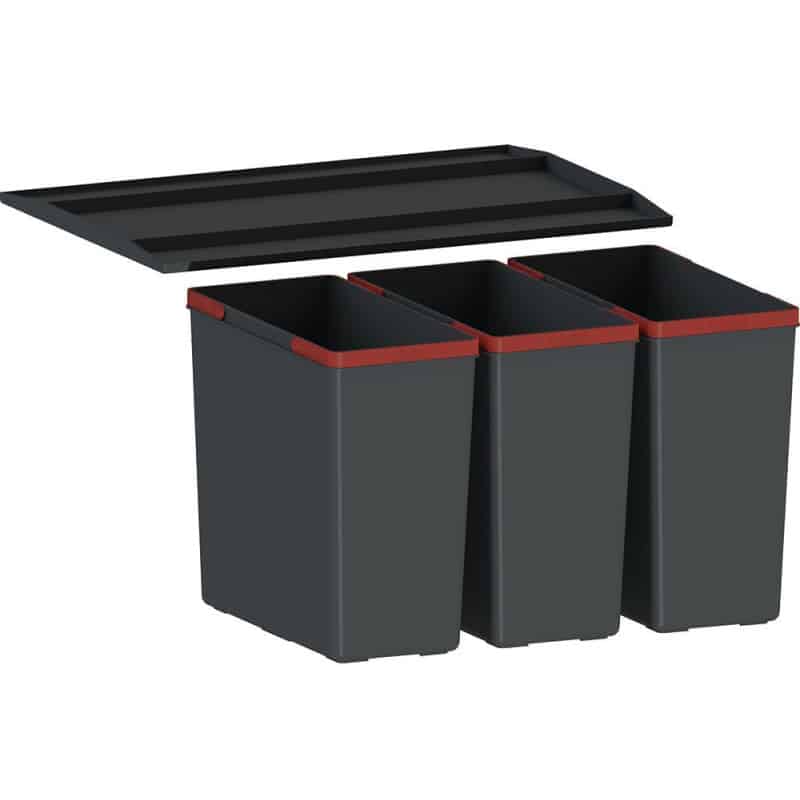 Systém košov od spoločnosti FRANKE je vyrobený z recyklovateľného antiseptického plastu. Disponuje s tromi 14,5 l košmi.andnbsp;Výška košov 324 mm. Kôš sa montuje do zásuvky s plnovýsuvom, ktorá je osadená pozdĺžnym relingom alebo vysokou bočnicou. Súčasťou balenia je polica nad košom -polica sa montuje medzi boky skrinky.