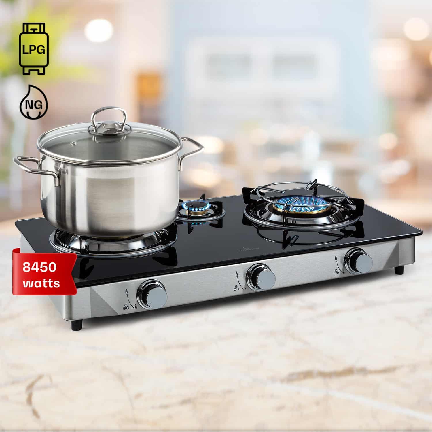 Klarstein Barzona 3, kempingový varič, 3 horáky, 3,4 kW a 0,75 kW a 4,3 kW, sklenená doska, kryt z nehrdzavejúcej ocele