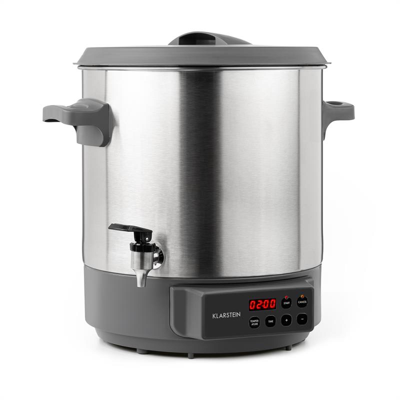 Teraz tu bude horúco: Klarstein Lady Marmalade zavárací automat je našou expertkou, keď sa jedná o dlhodobé zohrievanie, udržiavnie tepla a zaváranie.Dnes sa bude variť a zavárať! So zaváracím automatov Klarstein Lady Marmalade príde zmena na jedálny plán s dlhotrvajúcim efektom. Veľký 27 litrový zavárací hrniec ponúka dostatok miesta, aby obsah až 14 jednolitrových zaváracích pohárov premenil pomocou tepla na trvácne konzervy. Jedno či zelenina alebo ovocie ako čerešne, fazule alebo hrášok zo záhrady, nakladané uhorky, sladké lekváre, odvážne klobásové výtvory alebo už pripravený guláš, pečené mäso a rolády – s Lady Marmalade budú vždy zachované. Ovládanie je veľmi jednoduché: Uložte naplnené poháre do hrnca, naplňte vodou, zvoľte potrebnú teplotu na zaváranie medzi 30 a 100 °C, nastavte dobu zavárania od 5 do 12 hodín a môžete začať. Obzvlášť nápomocný je pritom vstavaný digitálny displej, na ktorom môžete všetky nastavenia odčítať. Hrniec samostatne udržuje nastavenú teplotu a vypne sa automaticky na konci zaváracej doby. Ochrana pred prehriatim sa stará od bezpečnosť pri zaváraní a vypne hrniec vtedy, keď už je príliš horúci alebo beží na sucho.Ale týmto nie sú schopnosti Klarstein Lady Marmalade ešte vyčerpané. Vďaka svojmu vkusnému a hygienickému interiéru z nerezovej ocele – Cool-Touch výpustnému kohútiku ako aj integrovanej funkcie na udržiavanie tepla sa výborne hodí ako zásobník na nápoje na teplý čaj, punč alebo varené víno a tým obohacuje oslavy, bufety a konferenčné miestnosti.Aj z vonku pôsobí zavárací automat Klarstein Lady Marmalade veľmi dobre. Vonkajší plášť je vyrobený z leštenej ušľachtilej ocele cez sivý plastový podklad. Úchyty Cool-Touch umožňujú jednoduchý prenos, zatiaľ čo plastová pokrievka ostáva chladná na dotyk.