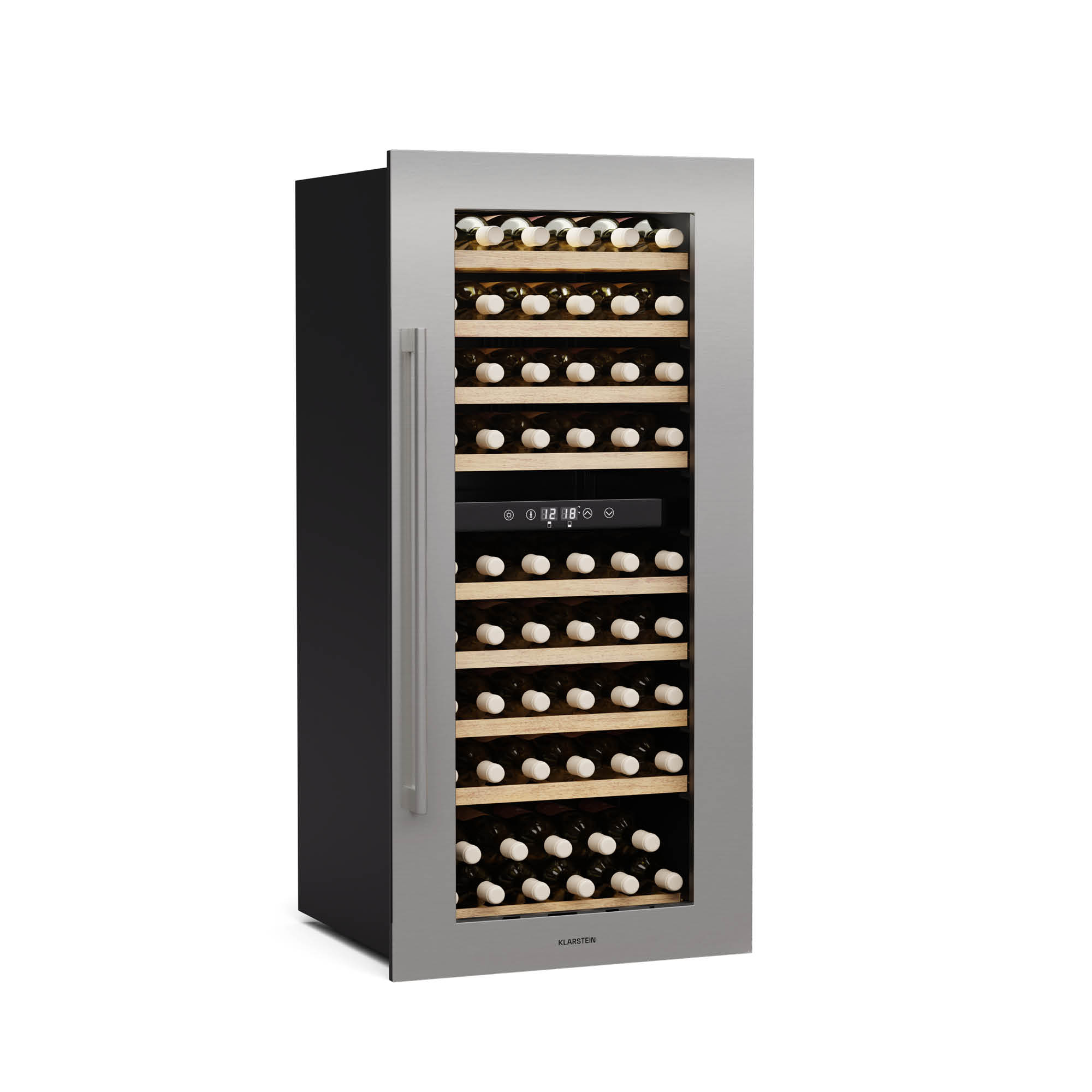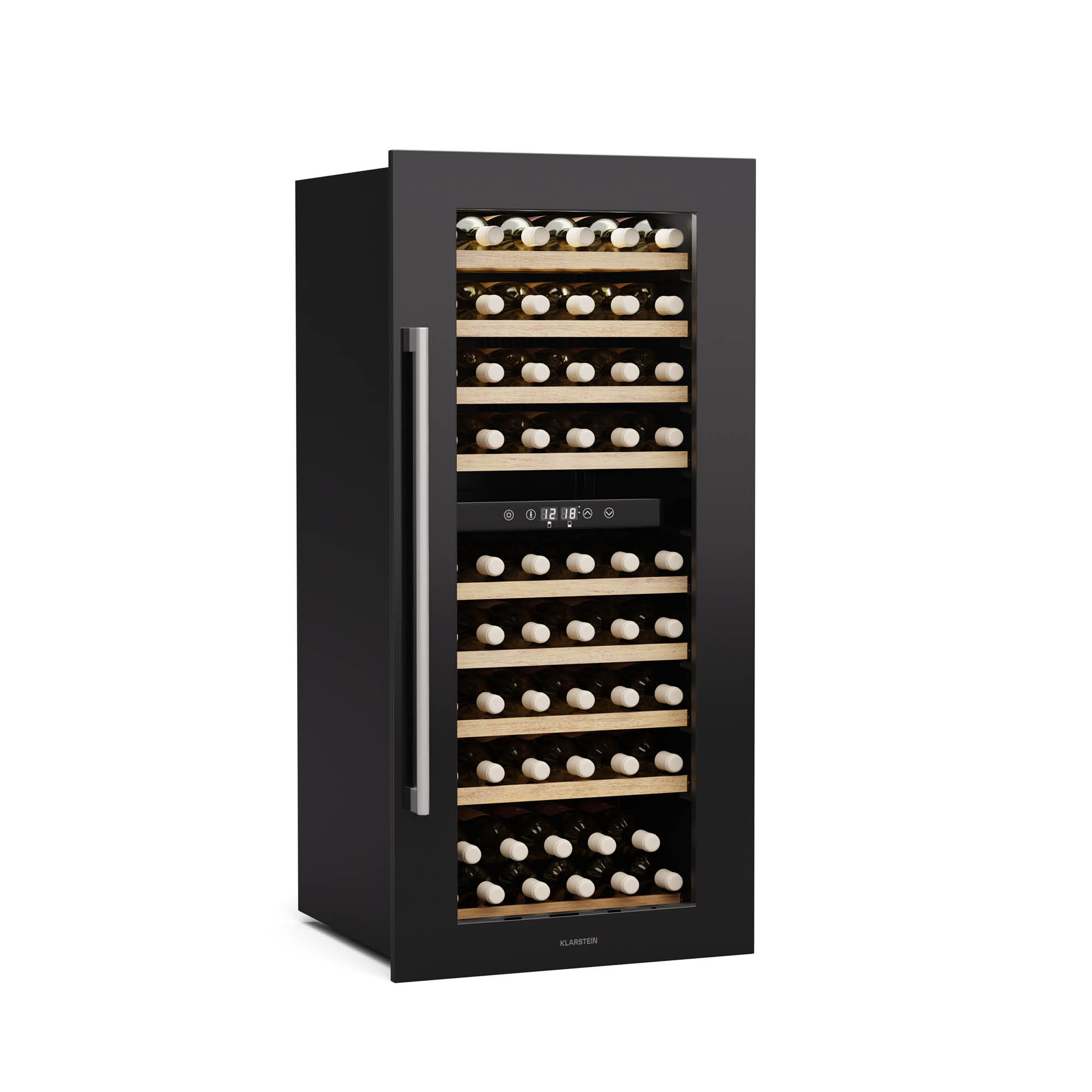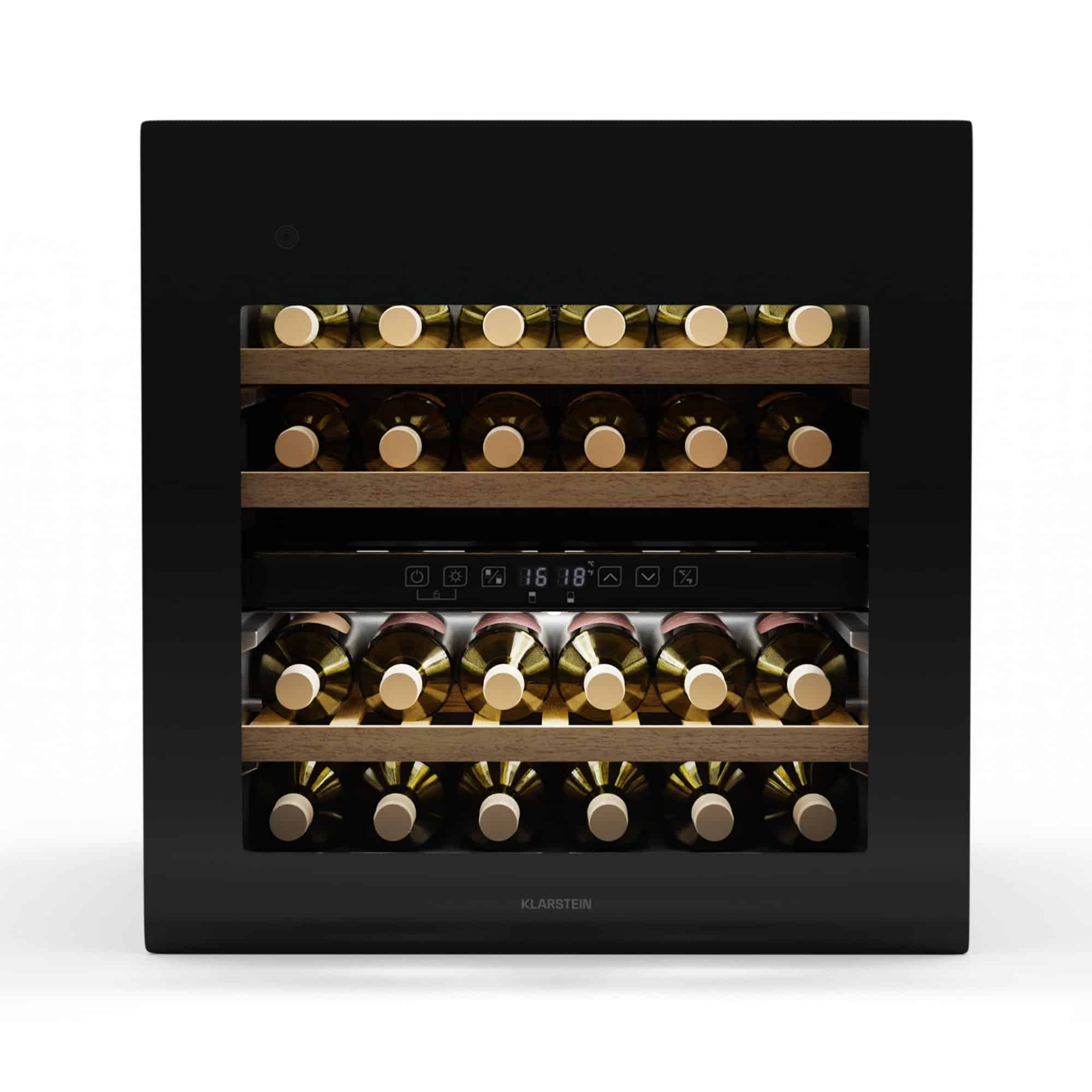 Elegantný dizajn a farebná prezentácia: Klarstein Vinovilla 17 Built-In Duo dvojzónová chladnicka na víno sa vdaka svojmu štíhlemu dizajnu hodí takmer do každého priestoru! Obe zóny možno nastavit oddelene, co umožnuje chladit a skladovat cervené a biele vína súcasne. Navyše šampanské, šumivé vína, sekty alebo iné jemné sekty sa dajú optimálne a dlhodobo skladovat aj v temperovacej skrinke. Táto dvojzónová vinotéka ponúka okrem najlepších podmienok na skladovanie a chladenie vašej zbierke vín extravagantnú scénu: za sklom sa flaše nádherne prezentujú – osvetlené cervenou, modrou alebo bielou farbou.