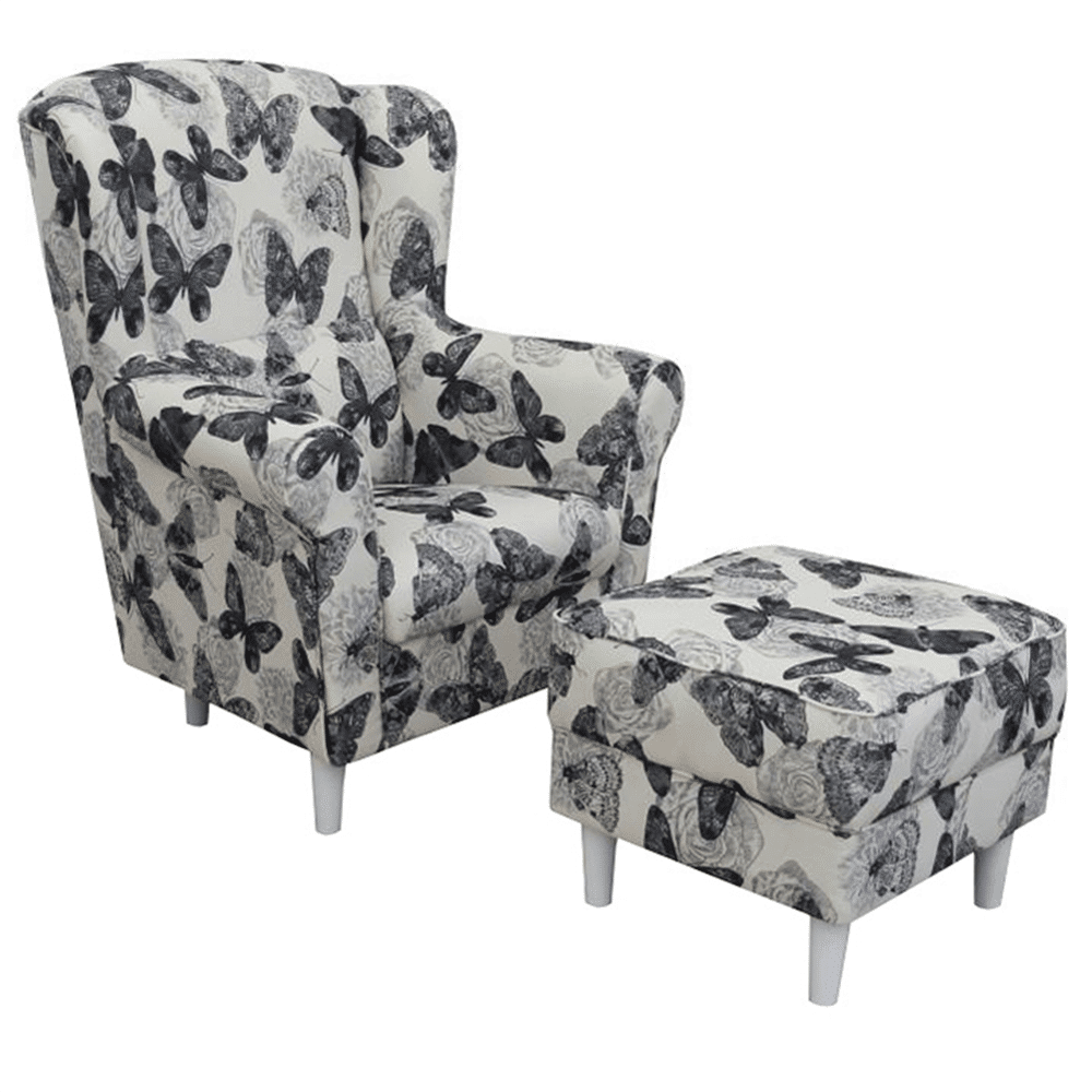 Kreslo ušiak s taburetom, látka butterfly 1 sivá s bielou/biela, ASTRID