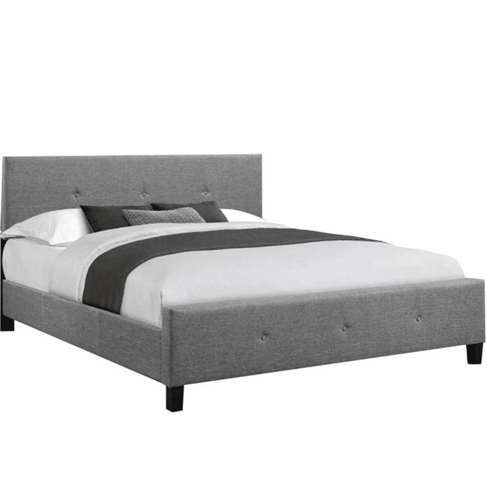Posteľ ATALAYA s roštovými doskami. Prevedenie sivá látka a čierne drevené nohy.
