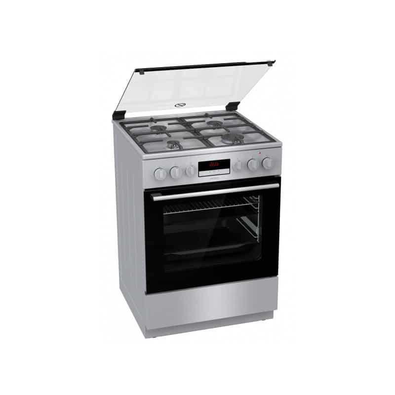 Kombinovaný sporák s funkciou pary, nerez, 4 plynové horáky s poistkami STOP GAS, LIATINOVÁ dvojdielna mriežka STABIL PLUS, INTEGROVANÉ zapaľovanie horákov, výsuvné teleskopické rošty/1 úroveň, tlmené dovieranie dvierok, energetická trieda – A, rozmery spotrebiča (v x š x h): 85 x 60 x 60 cm, multifunkčná rúra – 11 spôsobov ohrevu