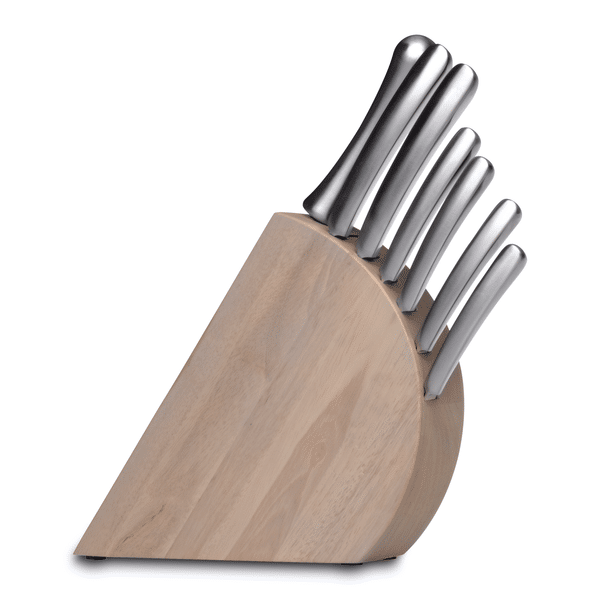 Nože Concavo 8-dielna sadaSada šiestich nožov a ocieľky v praktickom stojane. Nože majú ručne brúsené čepele. Nože sú vyrobené z vysoko kvalitnej chróm-molybdén-vanádiovej ocele (x50CrMoV15), šedý drevený blok na nože má protišmykovú základňu.Sada obsahuje:  1x nôž na šúpanie (6,5 cm) 1x kuchynský nôž (12 cm) 1x nôž na vykosťovanie (15 cm) 1x kuchynský nôž (15 cm)  1x nôž na chlieb (23 cm) 1x kuchársky nôž (23 cm) 1x ocieľka (23 cm) 1x blok na nože