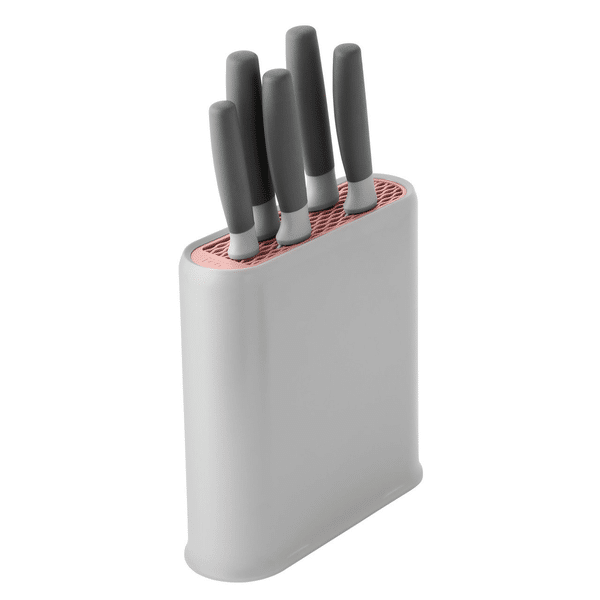 Nože Leo 6-dielna sadaStavte na poriadne nože, ktoré vám uľahčia prácu v kuchyni. Teraz ich môžete mať vždy po ruke a upratané na jednom mieste. Tento set obsahuje stojan a 5 nožov. Stojan má protišmykovú základňu a vnútornú vyberateľnú vložku, aby sa lepšie udržovala čistota stojana. Vložky na nože sú v dvoch farbách a tak si môžete navoliť svoj vlastný dizajn stojana, ktorý sa hodí do vašej kuchyne. Ergonomicky tvarované a dobre vyvážené nože s čepeľami z tvrdej ocele a rúčkami z mäkkého polypropylénu, vďaka čomu vám nevykĺznu len tak z rúk.Sada obsahuje:1x nôž na chlieb (23 cm)1x nôž šéfkuchára (19 cm)1x nôž na bylinky (14 cm)1x nôž na zeleninu a citrusy (11 cm)1x malý nôž (8,5 cm)1x stojan Materiál nožov: nehrdzavejúca oceľ (x30Cr13), polypropylénMateriál stojana: ABS, polypropylénVonkajšie rozmery stojana: 23,00 x 8,00 x 23,50 cmÚdržba nožov: odporúčame umývať ručne