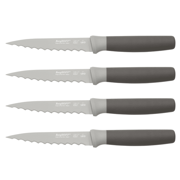 Nože Leo na steak 4ks (sivé)Ergonomicky tvarované a dobre vyvážené zubkované nože na steak. Ich čepele sú z tvrdej ocele a rúčky z mäkkého polypropylénu, vďaka čomu vám nevykĺznu len tak z rúk. Materiál: nehrdzavejúca oceľ (x30Cr13), polypropylénPočet nožov v balení: 4 ksVonkajšie rozmery: 24,00 x 3,50 x 2,00 cmDĺžka: 24 cmVýška: 2 cmČepeľ: 11,50 cmÚdržba: odporúčame umývať ručne