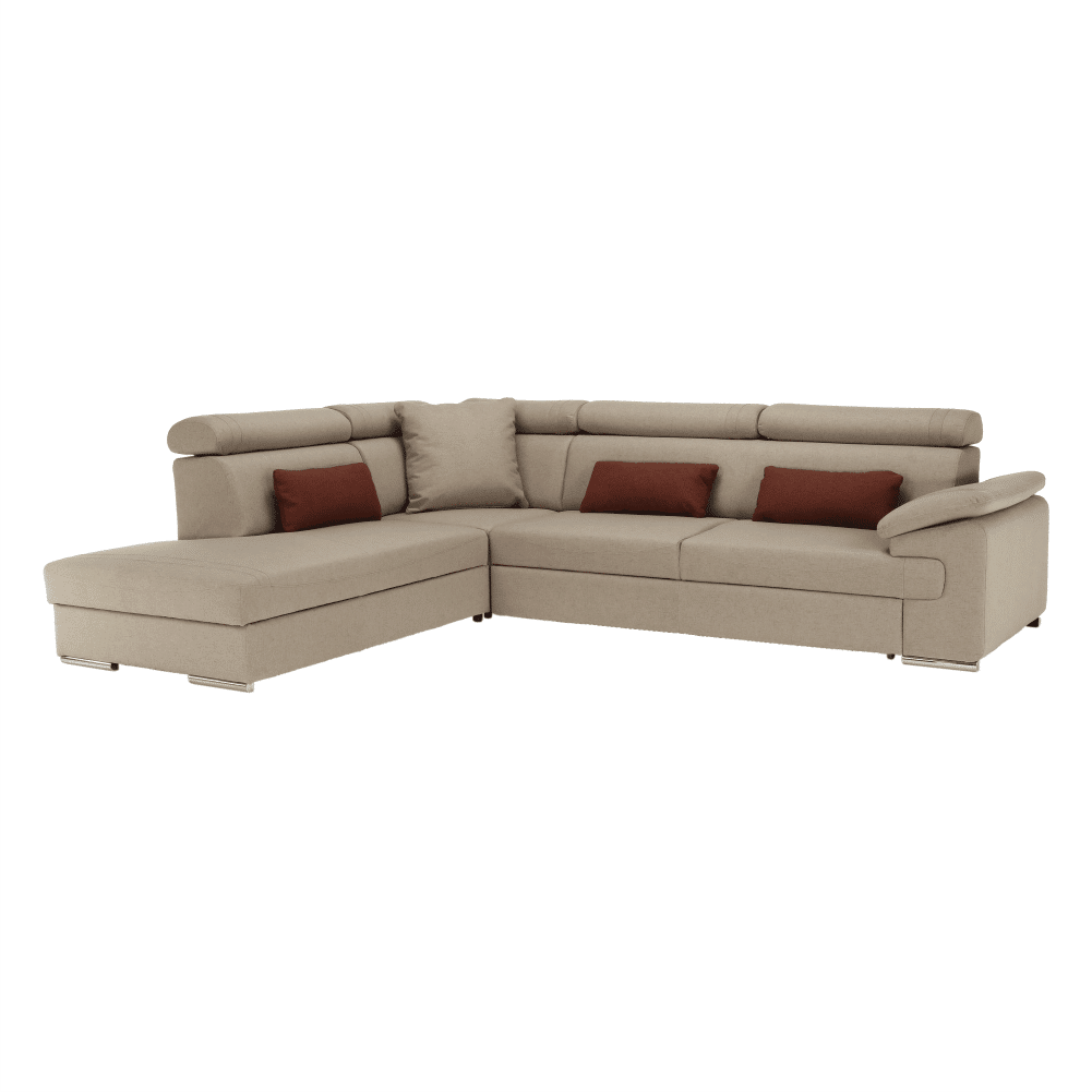 Celočalúnená rohová rozkladacia sedacia súprava s úložným priestorom, s polohovacím záhlavím.